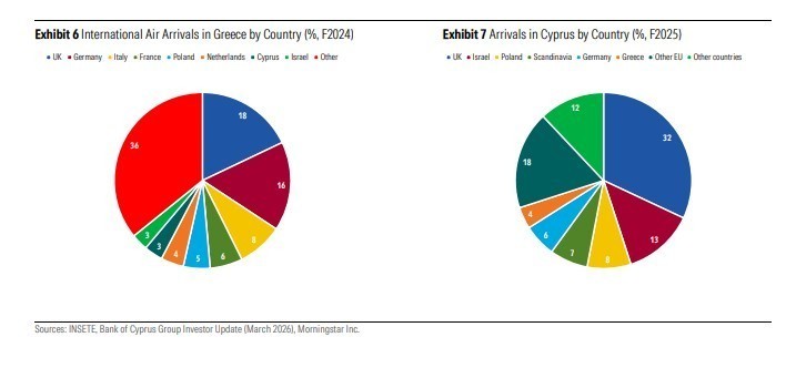 Οι αφίξεις στην Ελλάδα και την Κύπρο φαίνεται να παρουσιάζουν αρκετά μεγάλη διαφοροποίηση ανά χώρα· ωστόσο, η Κύπρος εμφανίζει μεγαλύτερη εξάρτηση από τους Ισραηλινούς επισκέπτες, γεγονός που θα μπορούσε να ασκήσει περαιτέρω πίεση λόγω του κλειστού εναέριου χώρου και των ακυρωμένων πτήσεων (Διαγράμματα 6-7).