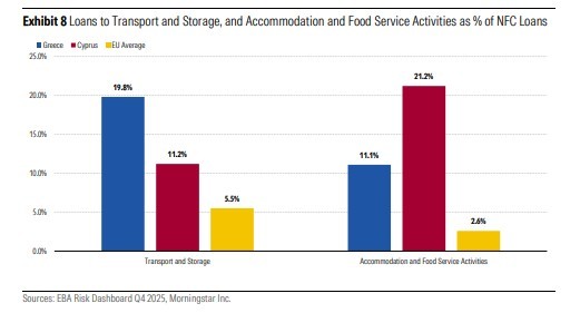 Από την άλλη, οι κυπριακές τράπεζες θα μπορούσαν να επηρεαστούν πιο άμεσα και σοβαρά, αντανακλώντας τη μεγαλύτερη συγκέντρωσή τους σε εκθέσεις που σχετίζονται με τον τουρισμό.