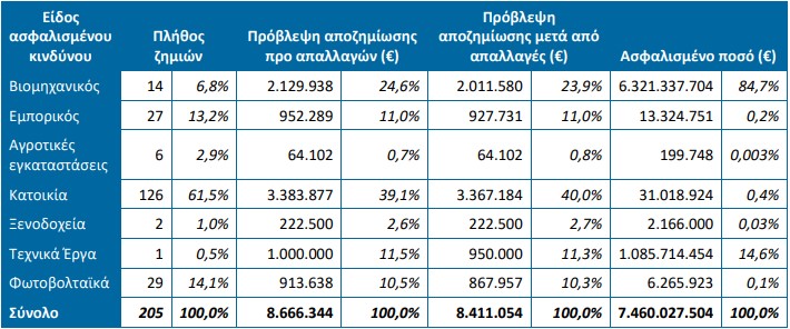Από αυτές, 205 ζημιές αφορούσαν τις ασφαλίσεις περιουσίας (εκτίμηση αποζημιώσεων €8,67 εκατ.) και 24 ζημιές τις ασφαλίσεις αυτοκινήτων (εκτίμηση €185.000).