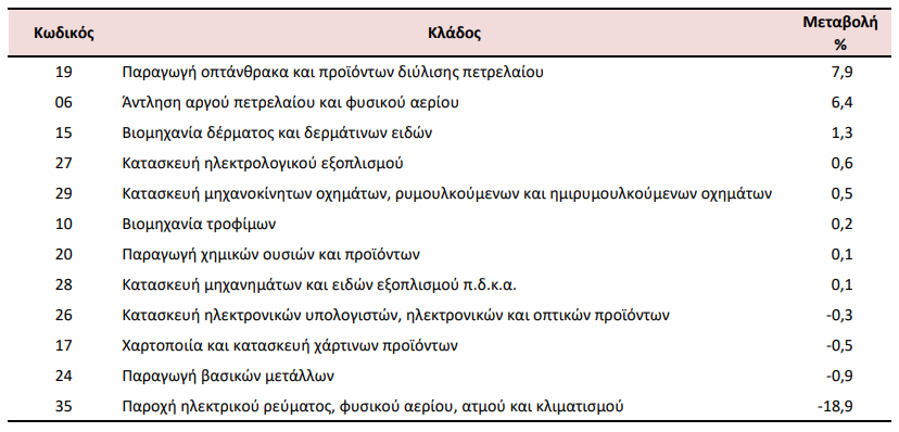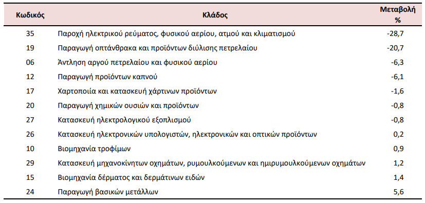Στη μείωση του Γενικού Δείκτη Τιμών Εισαγωγών (σύνολο αγοράς) κατά 3,2% συνέβαλαν κυρίως οι μεταβολές των δεικτών των διψήφιων κλάδων της ταξινόμησης NACE Αναθ. 2, ως εξής: