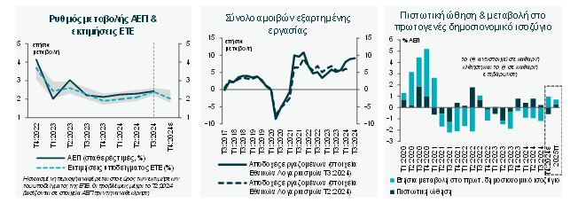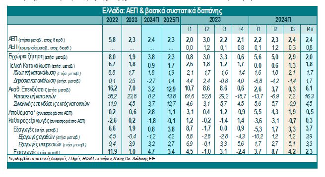 Συνδυάζοντας την ανωτέρω εκτίμηση με την επίδραση και άλλων παραγόντων που λειτουργούν υποστηρικτικά το 4ο τρίμηνο διατηρούμε αμετάβλητη την προηγούμενη πρόβλεψή μας για την αύξηση του ΑΕΠ το 2024 κατά 2,4% ετησίως.