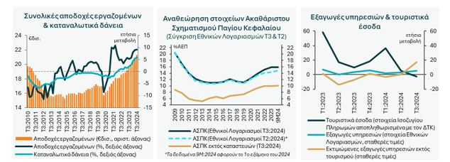 - Την ισχυρή αγορά εργασίας όπως αποτυπώνεται στο μονοψήφιο ποσοστό ανεργίας το 3ο τρίμηνο του 2024, για πρώτη φορά τα τελευταία 15 χρόνια, σε συνδυασμό με τη σταθερή αύξηση της απασχόλησης, το υψηλότερο ποσοστό συμμετοχής στο εργατικό δυναμικό και, κυρίως, την ενίσχυση των πραγματικών μισθών τα τελευταία τρίμηνα. Συγκεκριμένα, οι συνολικές αποδοχές των εργαζομένων κατέγραψαν αξιοσημείωτη αύξηση κατά 9,1% σε ετήσια βάση το 3ο τρίμηνο του 2024, έπειτα από το, ανοδικά αναθεωρημένο, 8,5% ετησίως το 1ο εξάμηνο του 2024 (αρχική εκτίμηση 5,8% ετησίως). Η εν λόγω αύξηση αντανακλά κυρίως τις υψηλότερες μισθολογικές αμοιβές (κατά περίπου 7,0% ετησίως το 3ο τρίμηνο του 2024, συμπεριλαμβανομένης της εκτιμώμενης επίδρασης από την μεταβολή των ωρών εργασίας), καθώς και την αύξηση της απασχόλησης (+1,7% σε ετήσια βάση το 3ο τρίμηνο του 2024). Οι ανωτέρω ευνοϊκές εξελίξεις προοιωνίζουν ενίσχυση του συνολικού πραγματικού διαθέσιμου εισοδήματος των νοικοκυριών (συμπεριλαμβάνοντας και την αύξηση της απασχόλησης) κατά σχεδόν 3,5% ετησίως το 2024, σύμφωνα με την εκτίμηση μας (έναντι αύξησης 2,2% ετησίως το 2023) σε επίπεδο 10,2% υψηλότερο συγκριτικά με το 2019, προ της πληθωριστικής κρίσης και της πανδημίας.