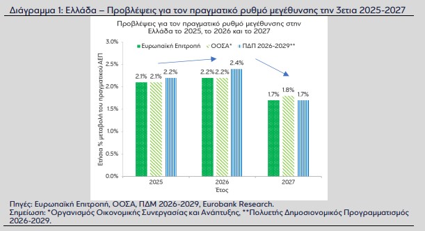 Για το σύνολο του έτους 2025, η Ευρωπαϊκή Επιτροπή (ΕΕπ) και ο Οργανισμός Οικονομικής Συνεργασίας και Ανάπτυξης (ΟΟΣΑ) τοποθετούν την ανάπτυξη στην Ελλάδα στο 2,1% (Διάγραμμα 1). Για το 2026 οι προβλέψεις των εν λόγω οργανισμών συγκλίνουν ξανά, εν προκειμένω στο 2,2%, ενώ για το 2027 διαφοροποιούνται οριακά, με την ΕΕπ να εκτιμά την ανάπτυξη στην Ελλάδα στο 1,7% και τον ΟΟΣΑ στο 1,8%. Οι δύο οργανισμοί τονίζουν στις ανακοινώσεις τους ότι η προβλεπόμενη επιβράδυνση της οικονομίας το 2027 συνδέεται με την ολοκλήρωση της απορρόφησης των κονδυλίων του Ταμείου Ανάκαμψης και Ανθεκτικότητας (ΤΑΑ) το 2026. Το σενάριο της φθίνουσας αναπτυξιακής δυναμικής στην Ελλάδα την επαύριον του ΤΑΑ υιοθετείται και στον Πολυετή Δημοσιονομικό Προγραμματισμό 2026-2029.