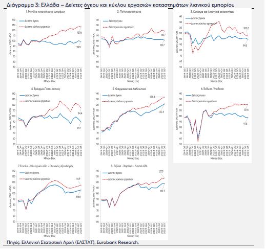 Επί παραδείγματι, ο δείκτης κύκλου εργασιών στο λιανικό εμπόριο το γ’ τρίμηνο 2025 ήταν αυξημένος κατά 21,7% σε σύγκριση με το 2021, ενώ ο αντίστοιχος δείκτης σε όρους όγκου ήταν μειωμένος κατά 0,5%. Οριακή αύξηση, στασιμότητα ή πτώση των πωλήσεων του λιανικού εμπορίου σε όρους όγκου σε σύγκριση με το 2021 καταγράφεται στα μεγάλα καταστήματα τροφίμων (υπεραγορές), στα πολυκαταστήματα, στα καύσιμα και λιπαντικά αυτοκινήτων, στα τρόφιμα-ποτά-καπνός και στην ένδυση-υπόδηση (Διαγράμματα 3.1, 3.2, 3.3, 3.4 και 3.6). Αντιθέτως, ενίσχυση σημειώνεται στα φαρμακευτικά-καλλυντικά, στα έπιπλα-ηλεκτρικά είδη-οικιακός εξοπλισμός και στα βιβλία-χαρτικά-λοιπά είδη (Διαγράμματα 3.5, 3.7 και 3.8).
