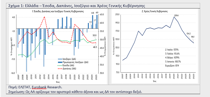 Σύμφωνα με την 1η κοινοποίηση της Ελληνικής Στατιστικής Αρχής (ΕΛΣΤΑΤ) για τα δημοσιονομικά στοιχεία των ετών 2022-2025, το 2025 το ισοζύγιο της Γενικής Κυβέρνησης (ΓΚ) ήταν πλεονασματικό στο 1,7% του Ακαθάριστου Εγχώριου Προϊόντος (ΑΕΠ) από 1,3% του ΑΕΠ το 2024. Το πρωτογενές ισοζύγιο ήταν επίσης πλεονασματικό στο 4,9% του ΑΕΠ το 2025, από 4,8% το 2024. Το δημόσιο χρέος υποχώρησε στο 146,1% του ΑΕΠ το 2025 από 154,2% του ΑΕΠ το 2024.