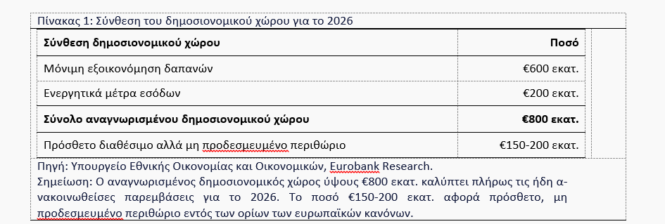 Πέραν αυτού, η επικαιροποιημένη αποτίμηση του δείκτη δαπανών αφήνει ένα πρόσθετο αλλά περιορισμένο περιθώριο, της τάξης των €150-200 εκατ., έως το ανώτατο όριο που επιτρέπουν οι ευρωπαϊκοί κανόνες, το οποίο, υπό τις παρούσες συνθήκες αυξημένης αβεβαιότητας, δεν προδεσμεύεται. Για λόγους σαφήνειας, η διάρθρωση του αναγνωρισμένου δημοσιονομικού χώρου για το 2026 και το πρόσθετο περιθώριο αποτυπώνονται συνοπτικά στον Πίνακα 1.