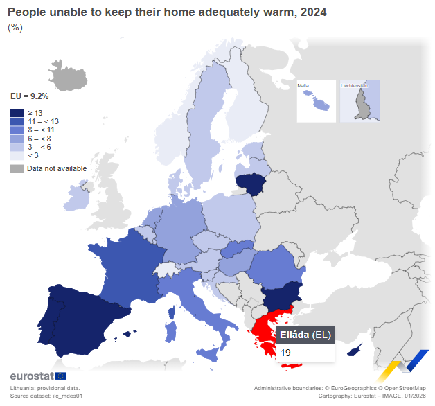 Περίπου ένας στους δέκα πολίτες της Ευρωπαϊκής Ένωσης δήλωσε το 2024 ότι αδυνατεί να διατηρεί την κατοικία του επαρκώς ζεστή, σύμφωνα με τα νεότερα στοιχεία της Eurostat. Συγκεκριμένα, το ποσοστό διαμορφώθηκε στο 9,2% του συνολικού πληθυσμού της ΕΕ.