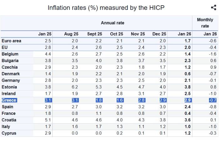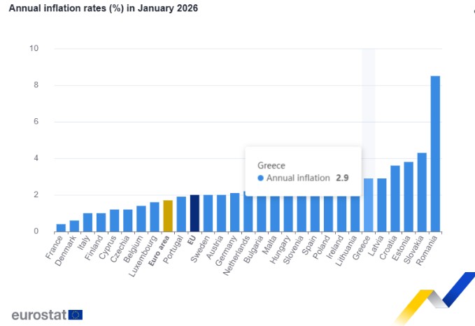 Σε σύγκριση με τον Δεκέμβριο του 2025, ο ετήσιος πληθωρισμός μειώθηκε σε 23 κράτη-μέλη, παρέμεινε σταθερός σε ένα και αυξήθηκε σε τρία.