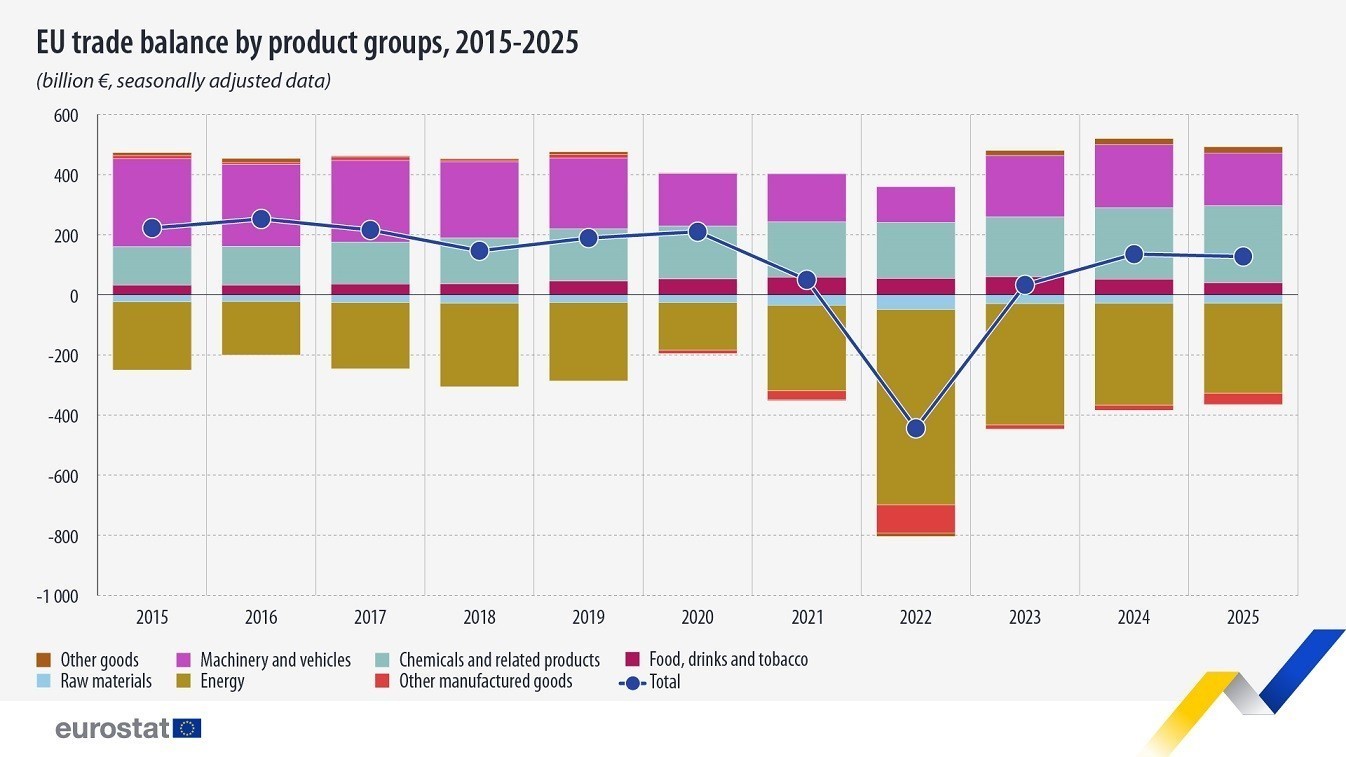 Σύμφωνα με τα στοιχεία της Eurostat, η ΕΕ διατηρεί σταθερά πλεονασματική εικόνα την τελευταία δεκαετία, με μοναδική εξαίρεση το ελλειμματικό 2022, έτος που σημαδεύτηκε από την ενεργειακή κρίση. Διαχρονικά, τα πλεονάσματα σε μηχανήματα, οχήματα και χημικά προϊόντα καταφέρνουν να αντισταθμίζουν τα ελλείμματα που προκαλεί ο τομέας της ενέργειας.