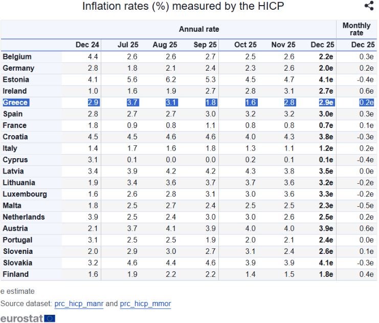 Στο 2,9% «τσίμπησε» οριακά ο ετήσιος πληθωρισμός στη χώρα μας τον Δεκέμβριο, σύμφωνα με τη Eurostat. Έναν μήνα πριν, ήταν στο 2,8% στην Ελλάδα και στο 2,1% στην ευρωζώνη.