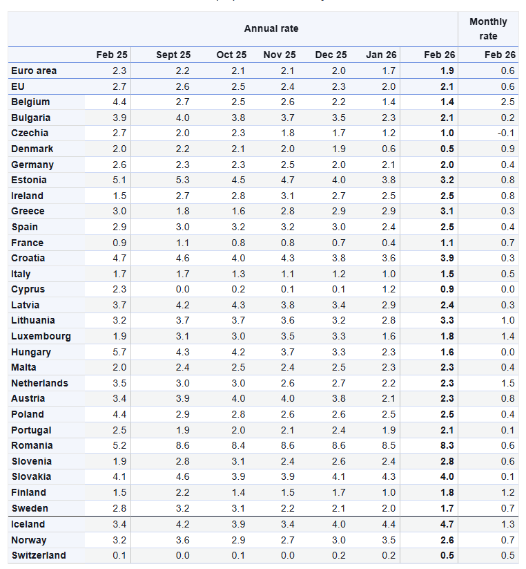 Σε σύγκριση με τον Ιανουάριο, ο ετήσιος πληθωρισμός μειώθηκε σε έντεκα κράτη-μέλη, παρέμεινε σταθερός σε τέσσερα και αυξήθηκε σε δώδεκα.