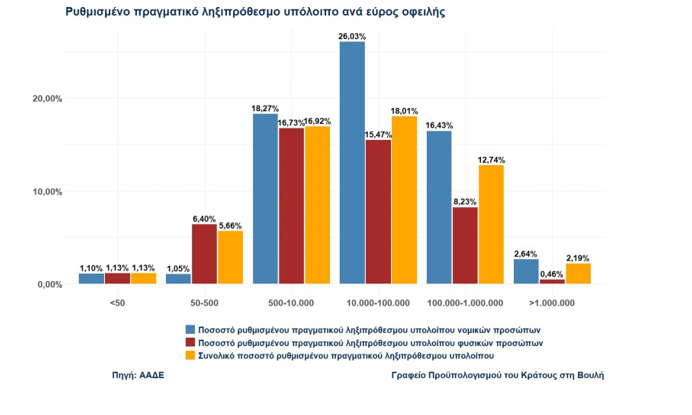 Χαμηλά ποσοστά ρύθμισης οφειλών διαπιστώνονται τόσο σε χαμηλά ποσά οφειλής (ιδιαίτερα κάτω των 500 ευρώ), όσο και σε υψηλά ποσά οφειλής (άνω των 50.000 ευρώ για φυσικά πρόσωπα και άνω των 300.000 ευρώ για νομικά πρόσωπα).