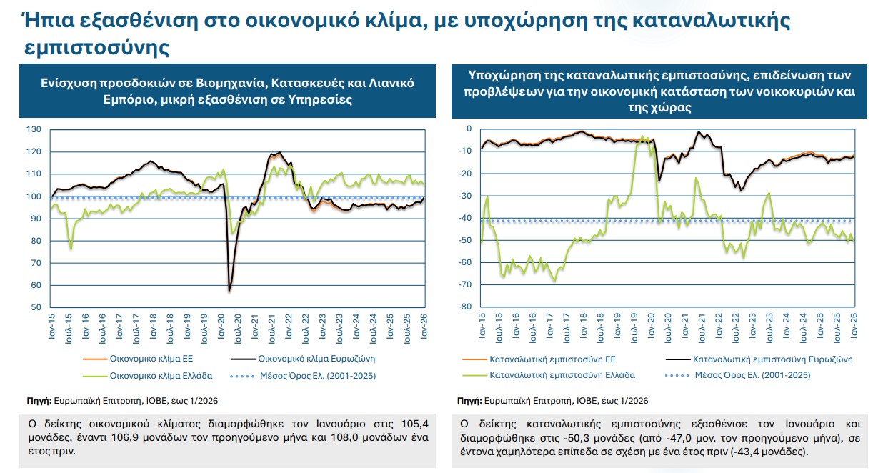Στο οικονομικό κλίμα, καταγράφηκε ήπια εξασθένιση τον Ιανουάριο 2026, στις 105,4 μονάδες έναντι 106,9 μονάδων τον προηγούμενο μήνα. Η πτώση αυτή συνοδεύτηκε από άνοδο σε κλάδους όπως η Βιομηχανία, οι Κατασκευές και το Λιανικό Εμπόριο, ενώ υποχώρησαν οι δείκτες στις Υπηρεσίες και στην Καταναλωτική Εμπιστοσύνη. Στη Βιομηχανία, οι προσδοκίες παρουσίασαν μικρή βελτίωση στις 105,8 μονάδες από 105,5 μονάδες τον προηγούμενο μήνα, αν και παραμένουν χαμηλότερα σε σχέση με ένα χρόνο πριν (108,1 μονάδες).
