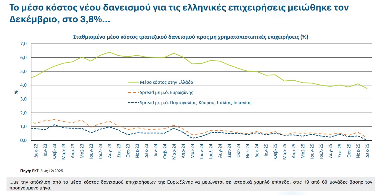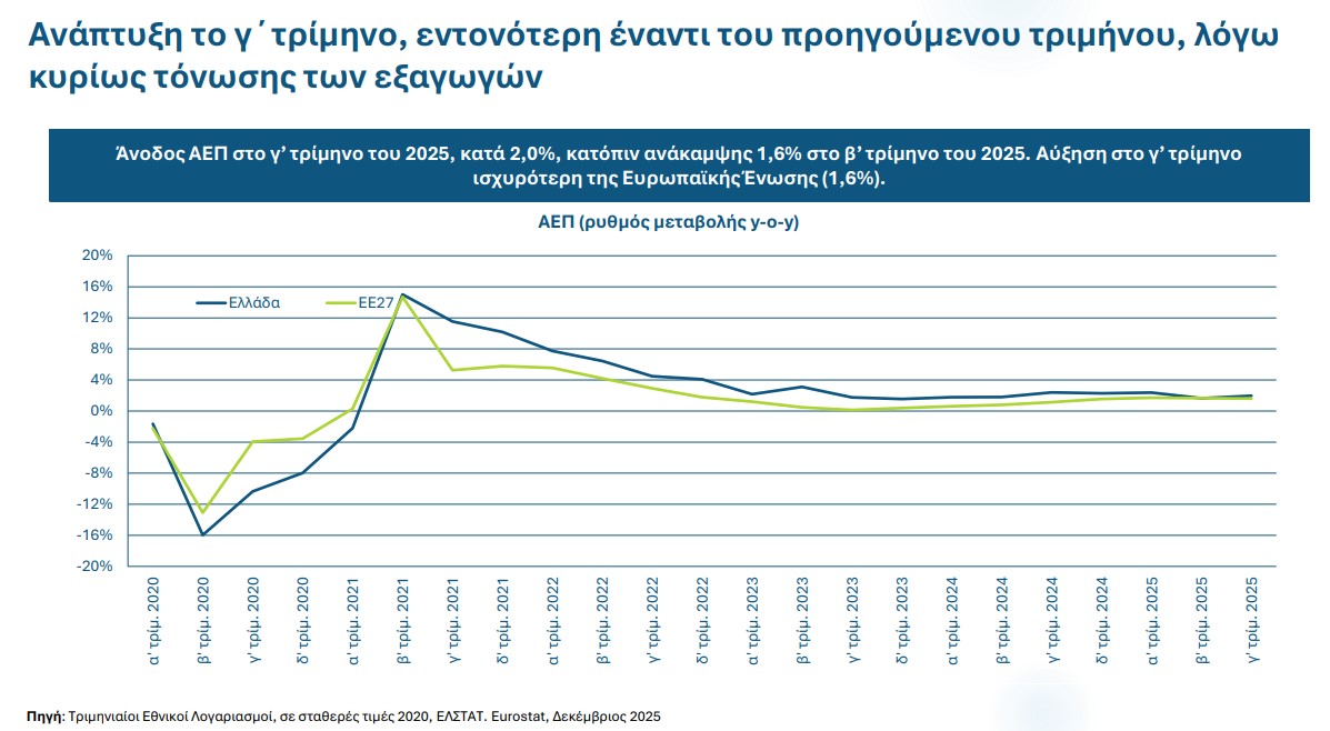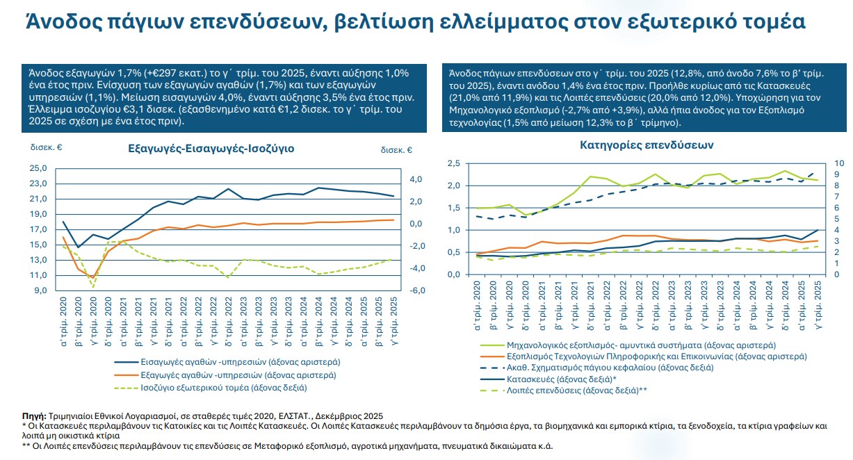 Η βιομηχανική παραγωγή ενισχύθηκε τον Δεκέμβριο, καταγράφοντας αύξηση 4,0% σε ετήσια βάση στην Ελλάδα, έναντι 1,4% στην ΕΕ27. Σημαντική ήταν η άνοδος στην εγχώρια Μεταποίηση, που σημείωσε 3,8% σε σύγκριση με τον προηγούμενο χρόνο. Ωστόσο, οι εξαγωγές της Βιομηχανίας υποχώρησαν τον Νοέμβριο κατά 1,2%, με το εμπορικό έλλειμμα να μειώνεται στα 3,5 δισ. ευρώ από 3,8 δισ. ευρώ ένα χρόνο πριν.