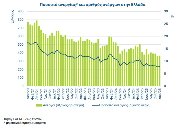 Συγκεκριμένα, η ανεργία συνεχίζει να υποχωρεί, με το ποσοστό τον Δεκέμβριο του 2025 να διαμορφώνεται στο 7,9%, καταγράφοντας μείωση 18,1% σε σχέση με τον Δεκέμβριο του 2024.