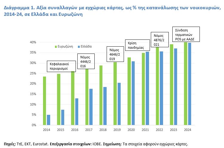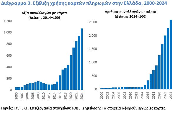 Όπως προκύπτει από τη μελέτη του ΙΟΒΕ, η χρήση καρτών έχει διευρυνθεί συστηματικά μετά το 2014, σε συνέχεια της επιβολής κεφαλαιακών περιορισμών, των μέτρων προώθησης των ηλεκτρονικών πληρωμών (νόμοι 4446/2016, 4646/2019, 4876/2021), της κρίσης πανδημίας, αλλά και διοικητικών μέτρων όπως η σύνδεση των τερματικών POS με την ΑΑΔΕ το 2024 (Διάγραμμα 1).