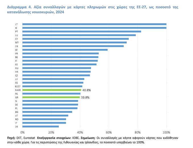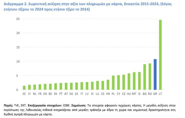 Τη δεύτερη ταχύτερη εξάπλωση της χρήσης καρτών στην ΕΕ των 27 σημειώνει η Ελλάδα τη δεκαετία 2015-2024, σύμφωνα με νέα μελέτη του Ιδρύματος Οικονομικών και Βιομηχανικών Ερευνών (ΙΟΒΕ).