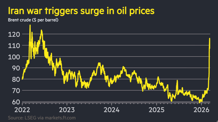 Ενεργειακό σοκ, με τις τιμές του πετρελαίου να συνεχίζουν και σήμερα την ιστορική άνοδό τους, με την τιμή, μάλιστα, του αμερικανικού αργού (WTI) να αυξάνεται κατά 20% και του Brent κατά 21%, έχοντας ξεπεράσει πλέον αμφότερες τα 112 δολάρια το βαρέλι, καθώς οι αγορές έχουν καταληφθεί από πανικό μπροστά στη συνέχιση του πολέμου στη Μέση Ανατολή και το de facto κλείσιμο του Στενού του Χορμούζ