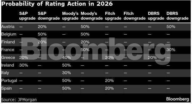 Για τη δεύτερη μεγαλύτερη οικονομία της ευρωζώνης, οι αναλυτές της JPMorgan υπολογίζουν πιθανότητα 50% για υποβάθμιση από τη Moody’s, ενώ η αντίστοιχη πιθανότητα από τη DBRS διαμορφώνεται στο 30%.