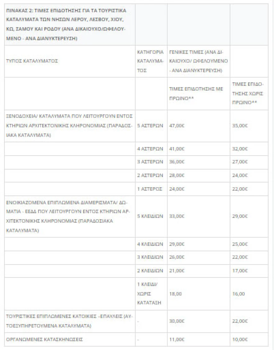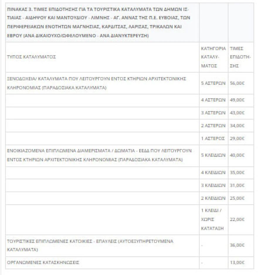 Το ύψος της οικονομικής αξίας της επιταγής που αποτελεί την επιδότηση του δικαιούχου και των ωφελουμένων του για τη διαμονή τους σε τουριστικά καταλύματα, είναι ανάλογο με τη διάρκεια της διαμονής, την περιοχή, τον τύπο, την περίοδο και την κατηγορία του τουριστικού καταλύματος και ορίζεται ως εξής: