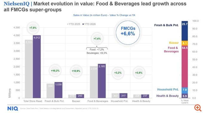 Σύμφωνα με τα πιο πρόσφατα στοιχεία της NielsenIQ για την περίοδο 29 Δεκεμβρίου 2025 – 29 Μαρτίου 2026, η συνολική αγορά των FMCGs στο λιανεμπόριο τροφίμων κατέγραψε αύξηση πωλήσεων σε αξία κατά +6,6%, με την ανάπτυξη να είναι κυρίως καθοδηγούμενη από τη ζήτηση, όπως αποτυπώνεται και στην παράλληλη αύξηση των πωλήσεων σε όγκο (+4,7%).