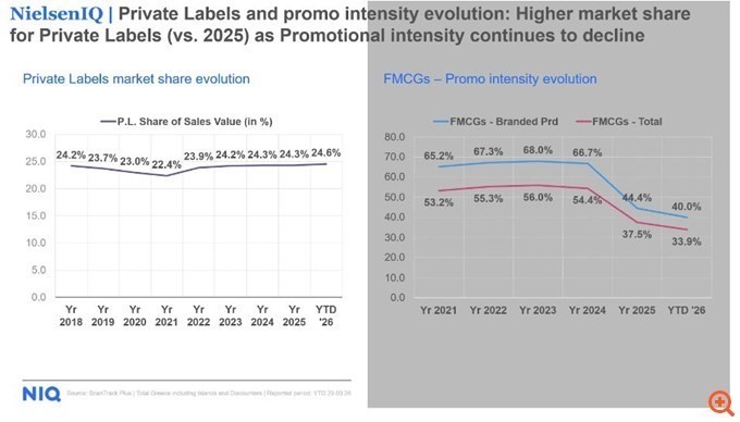 Σε επίπεδο καναλιών, τα hypermarkets παρουσίασαν ρυθμό ανάπτυξης υψηλότερο από τον μέσο όρο της αγοράς, στο +11,6%, ενώ γεωγραφικά, Κρήτη και Νησιά ξεχώρισαν με ρυθμούς ανάπτυξης σημαντικά υψηλότερους από τον μέσο όρο της χώρας, στο 9,6% & 8,6% αντίστοιχα, σε σχέση με την αντίστοιχη χρονική περίοδο του 2025.