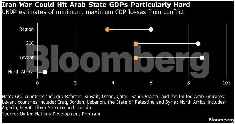 Ειδικότερα, τα αραβικά κράτη κινδυνεύουν να χάσουν μεταξύ 120 δισεκατομμυρίων δολαρίων και 194 δισεκατομμυρίων δολαρίων από το ΑΕΠ τους ως αποτέλεσμα του πολέμου, σύμφωνα με ανάλυση του Προγράμματος Ανάπτυξης του ΟΗΕ σχετικά με τις οικονομικές και κοινωνικές συνέπειες για τα αραβικά κράτη, η οποία δημοσιεύθηκε σήμερα Τρίτη.