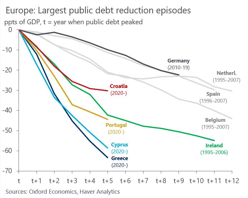 Παραθέτοντας έναν πίνακα από το Oxford Economics και Haver Analytics, ο κ. Πιερρακάκης τονίζει πως επιβεβαιώνεται ότι η Ελλάδα καταγράφει την ταχύτερη μείωση χρέους στην ιστορία. «Είναι επιλογή μας», προσθέτει.