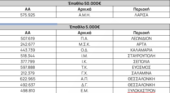 Πιο συγκεκριμένα, στην 10η κλήρωση τα μεγάλα έπαθλα των 50.000€ & 5.000€ κέρδισαν οι ακόλουθοι: