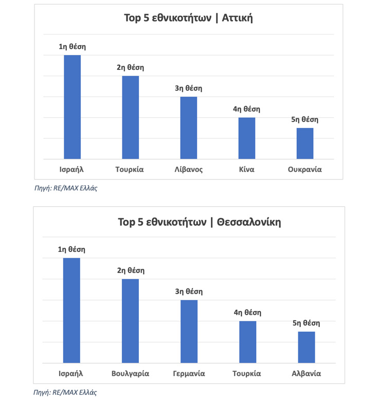 Οι Ισραηλινοί βρίσκονται στην πρώτη θέση μεταξύ των ξένων που αγοράζουν ακίνητα στη Θεσσαλονίκη, ενώ την πρώτη πεντάδα συμπληρώνουν αγοραστές από τη Βουλγαρία, τη Γερμανία, την Τουρκία και την Αλβανία. Στην υπόλοιπη Ελλάδα, οι Γερμανοί αντιπροσωπεύουν το μεγαλύτερο ποσοστό των ξένων αγοραστών, με τους Βούλγαρους και τους Γάλλους να έχουν, επίσης, ισχυρή παρουσία, ενώ Ισραηλινοί και Τούρκοι ακολουθούν.