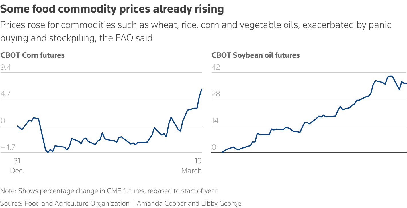 Οι τιμές βασικών εμπορευμάτων όπως το σιτάρι, το ρύζι, το καλαμπόκι και τα φυτικά έλαια έχουν ήδη αυξηθεί, εν μέρει λόγω πανικού και αποθεματοποίησης, σύμφωνα με την Food and Agriculture Organization.