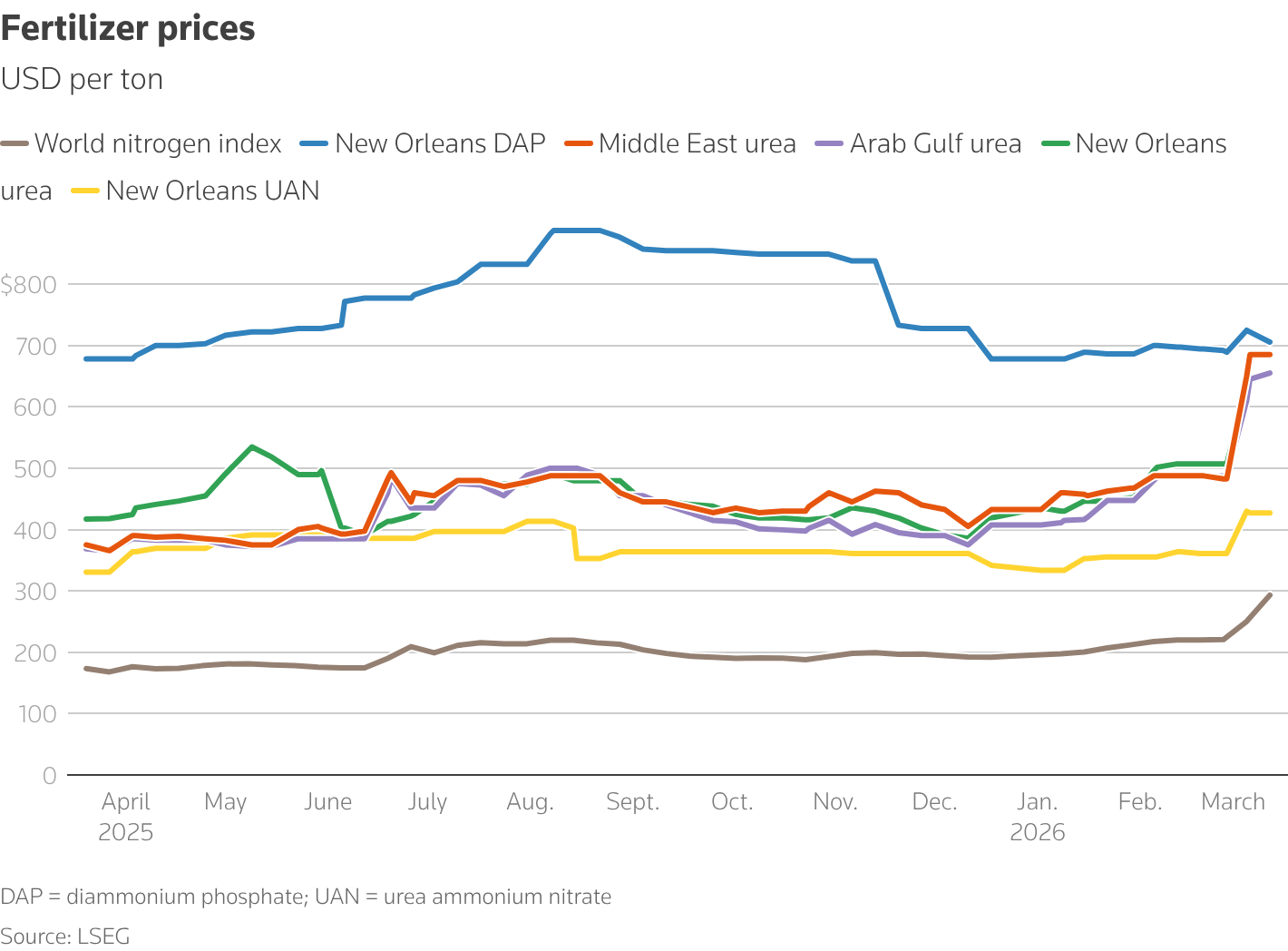 Ένα βασικό σημείο πίεσης είναι τα λιπάσματα. Το Στενό του Ορμούζ, που έχει ουσιαστικά μπλοκαριστεί από την Τεχεράνη, διακινεί περίπου το 30% του παγκόσμιου εμπορίου λιπασμάτων, ενώ οι χώρες του Κόλπου είναι σημαντικοί προμηθευτές αμμωνίας και ουρίας, σύμφωνα με την Διεθνή Οργάνωση Τροφίμων και Γεωργίας. Η Tράπεζα της Αμερικής προειδοποιεί ότι η σύγκρουση απειλεί το 65% έως 70% της παγκόσμιας προσφοράς ουρίας, ενώ οι τιμές έχουν ήδη αυξηθεί κατά 30% έως 40%.