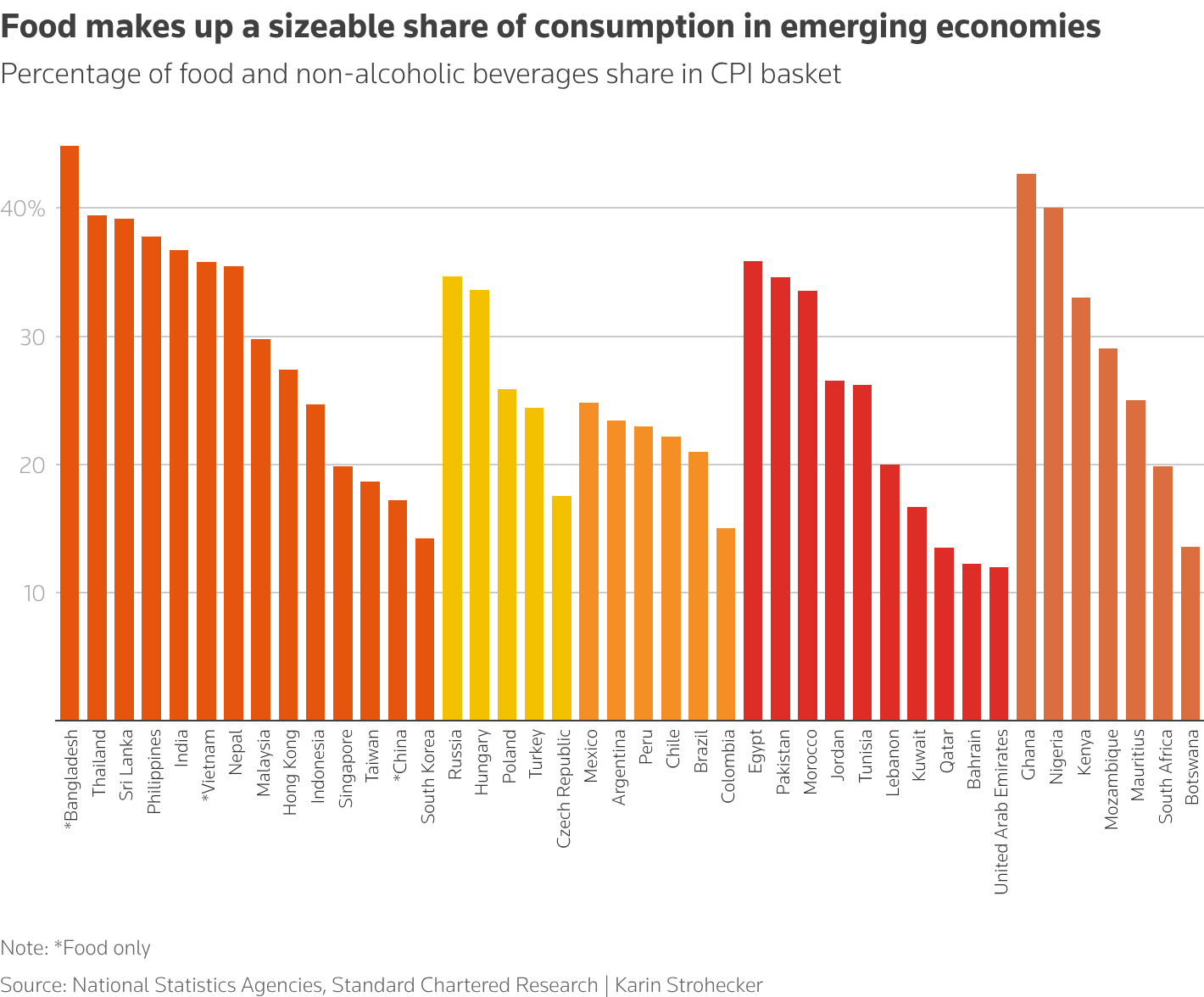 Τα τρόφιμα και τα καύσιμα αποτελούν λιγότερο από το ένα τέταρτο του καλαθιού του πληθωρισμού στις περισσότερες ανεπτυγμένες οικονομίες, αλλά φτάνουν το 30% έως 50% σε πολλές αναδυόμενες αγορές, όπως δήλωσε η Μαρί Ντιρόν της Moody’s. «Αυτή η έκθεση καθιστά πολλές οικονομίες ιδιαίτερα ευάλωτες σε εξωτερικά προερχόμενη μεταβλητότητα τιμών», ανέφερε.