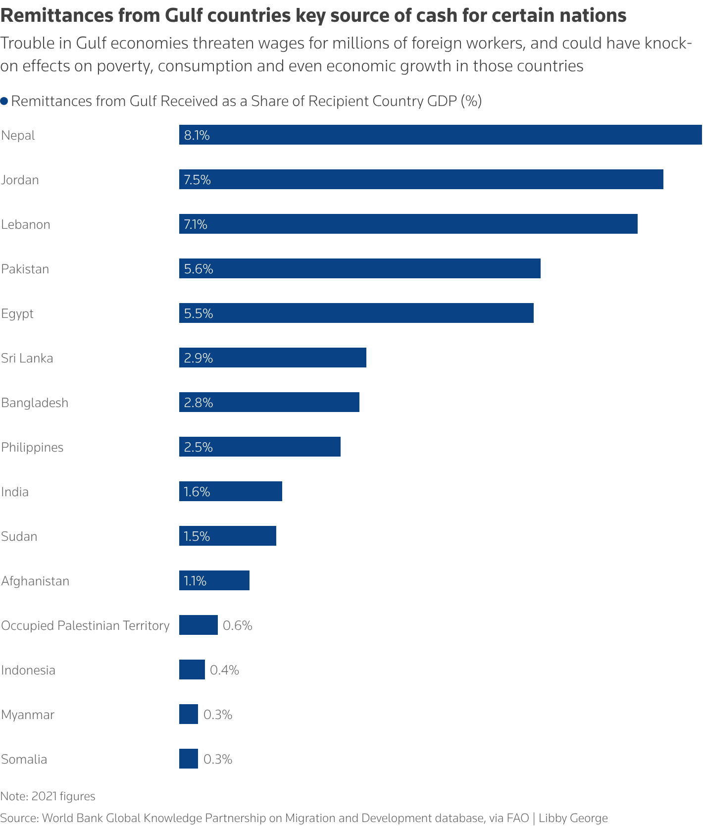 Τα προβλήματα στις οικονομίες του Κόλπου απειλούν τα εισοδήματα εκατομμυρίων ξένων εργαζομένων και ενδέχεται να έχουν αλυσιδωτές επιπτώσεις στη φτώχεια, την κατανάλωση και ακόμη και την οικονομική ανάπτυξη αυτών των χωρών.