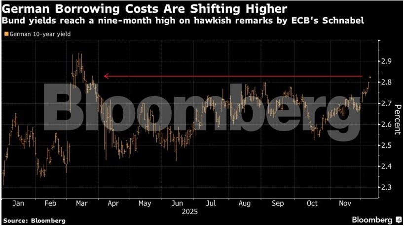 Να σημειωθεί ότι μετά τις δηλώσεις της Σνάμπελ, οι αποδόσεις των γερμανικών 10ετών ομολόγων αυξήθηκαν κατά τρεις μονάδες βάσης στο 2,83%, ενώ το επιτόκιο του μακροπρόθεσμου χρέους βρίσκεται ήδη στο υψηλότερο επίπεδο από το 2011.