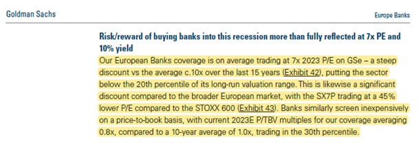 Η Goldman παρόλο που πιστεύει ότι η ευρωπαϊκή οικονομία θα είναι σε ύφεση μας προτείνει να αγοράσουμε ευρωπαϊκές τράπεζες γιατί ήδη έχουν τιμολογήσει την ύφεση.