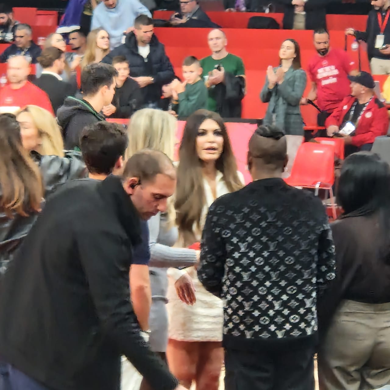 Κάθισε βεβαίως στις θέσεις VIP ανάμεσα στους Παναγιώτη και Γιώργο Αγγελόπουλο φορώντας λευκά (όχι ερυθρόλευκα) κι έχοντας δίπλα της τον στενό της φίλο Χρήστο Μαραφάτσο. Ηταν και ο γιος της μαζί, όπως και ο αποκλειστικός της στυλίστας, ο Fancy James καθώς και πολλοί άλλοι συνεργάτες της.