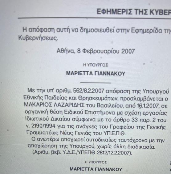 Ωστόσο, με βάση το ΦΕΚ με το οποίο διορίστηκε ο υφυπουργός, αναφέρεται: «Με την υπ’ αριθμ. 562/8.2.2007 απόφαση της Υπουργού Εθνικής Παιδείας και Θρησκευμάτων, προσλαμβάνεται ο ΜΑΚΑΡΙΟΣ ΛΑΖΑΡΙΔΗΣ του Βασιλείου, από 16.1.2007, σε οργανική θέση Ειδικού Επιστήμονα με σχέση εργασίας Ιδιωτικού Δικαίου σύμφωνα με το άρθρο 33 παρ. 2 του ν. 2190/1994 για τις ανάγκες του Γραφείου της Γενικής Γραμματέως Νέας Γενιάς του ΥΠ.Ε.Π.Θ.»