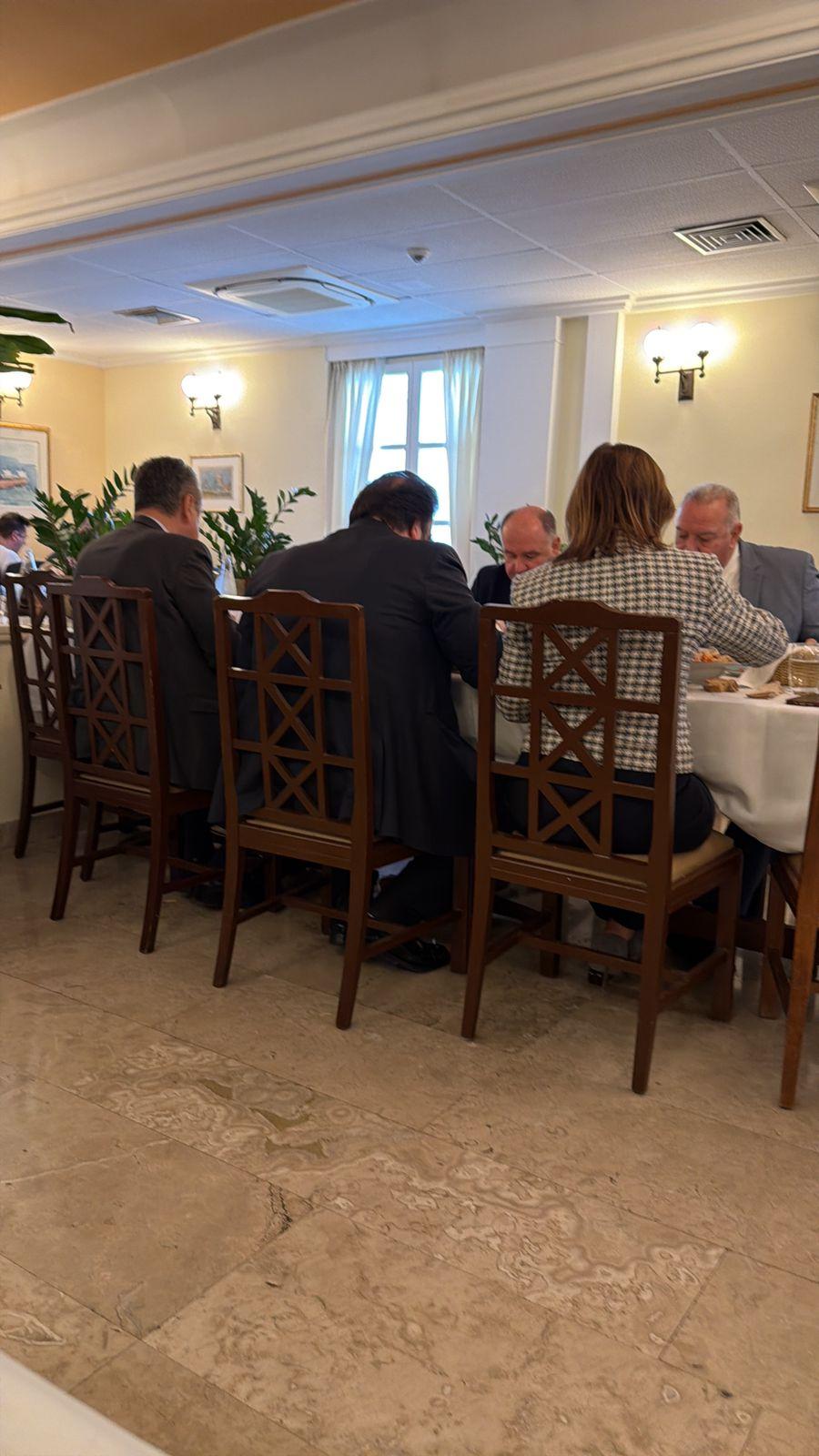 Στο ίδιο τραπέζι βρίσκονταν και η Μαρία Κεφάλα, ο Γιώργος Κωτσός και ο Γιώργος Γιάννης. Το κλίμα μεταξύ τους ήταν παραπάνω από καλό και τα χαμόγελα περίσσευαν. Ωστόσο ο Πιερρ αναγκάστηκε να αφήσει άρον άρον την παρέα μόλις αντιλήφθηκε ότι στο βήμα της Ολομέλειας είχε ανέβει ο Βελόπουλος και πήγε στα υπουργικά έδρανα για να τον ακούσει και να απαντήσει στις κατηγορίες του.