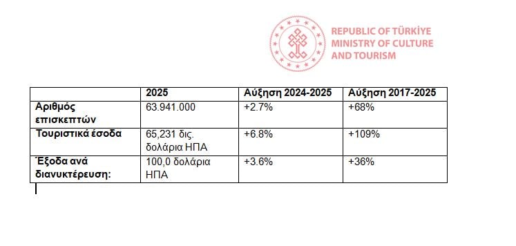 Ο Υπουργός Πολιτισμού και Τουρισμού της Τουρκίας, Mehmet Nuri Ersoy, σε συνέντευξη Τύπου που πραγματοποιήθηκε στην Κωνσταντινούπολη, ανακοίνωσε ότι η Τουρκία το 2025 υποδέχθηκε 64 εκατομμύρια επισκέπτες, και σημείωσε έσοδα από τον τουρισμό ύψους 65,231 δισεκατομμυρίων δολαρίων ΗΠΑ.
