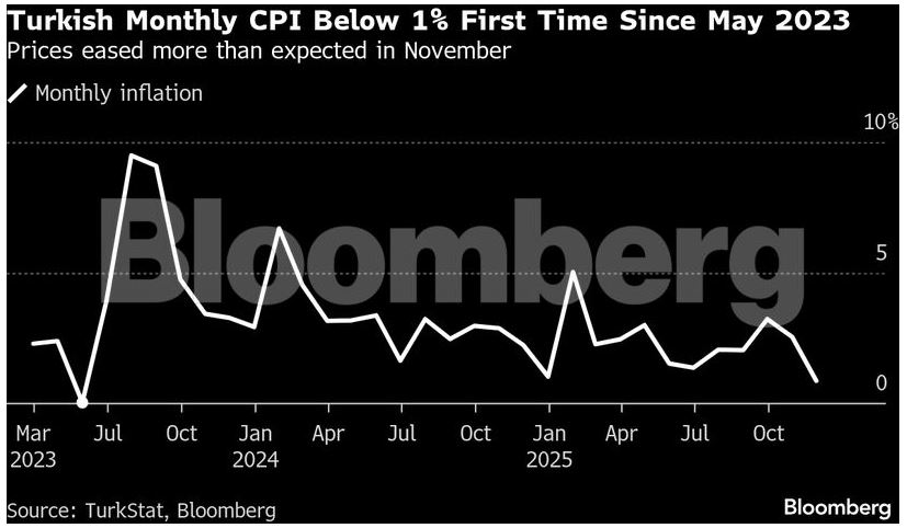 Ο πληθωρισμός στην Τουρκία υποχώρησε περισσότερο από το αναμενόμενο τον Νοέμβριο, ανοίγοντας τον δρόμο για την κεντρική τράπεζα να προχωρήσει σε μια πιο σημαντική μείωση των επιτοκίων την επόμενη εβδομάδα.