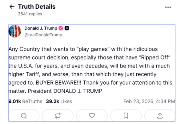 Νωρίτερα τη Δευτέρα, ο Τραμπ απείλησε με υψηλότερους δασμούς στα προϊόντα χωρών που «παίζουν παιχνίδια» με τις υφιστάμενες εμπορικές συμφωνίες τους με τις ΗΠΑ, μετά την απόφαση του Ανώτατου Δικαστηρίου που ακύρωσε τους παγκόσμιους δασμούς του.