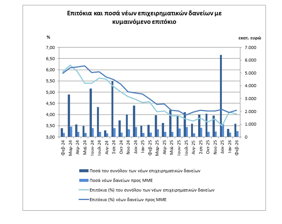 Το μέσο σταθμισμένο επιτόκιο του συνόλου των νέων δανείων προς νοικοκυριά και επιχειρήσεις μειώθηκε κατά 7 μονάδες βάσης και διαμορφώθηκε στο 4,57%.