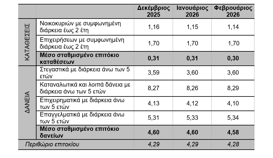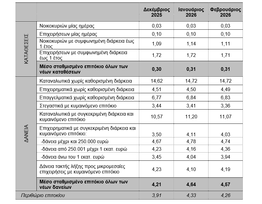 Τον Φεβρουάριο του 2026, το μέσο σταθμισμένο επιτόκιο του συνόλου των νέων καταθέσεων παρέμεινε αμετάβλητο, σε σχέση με τον προηγούμενο μήνα, στο 0,31%.