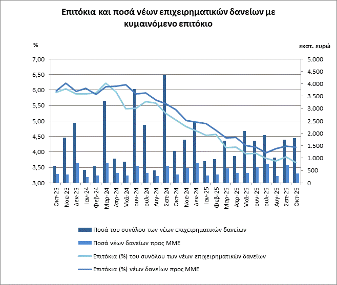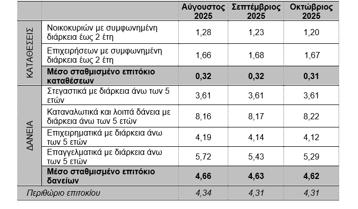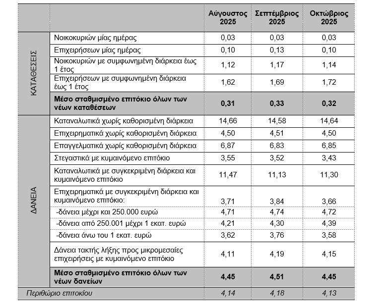 Τον Οκτώβριο του 2025, το μέσο σταθμισμένο επιτόκιο των νέων καταθέσεων παρέμεινε σχεδόν αμετάβλητο στο 0,32%, ενώ το αντίστοιχο επιτόκιο των νέων δανείων μειώθηκε στο 4,45%, σύμφωνα με στοιχεία της Τράπεζας της Ελλάδος.
