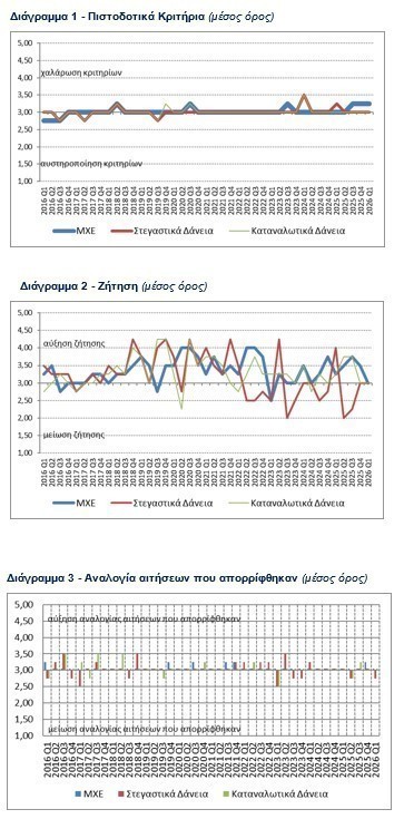 Κατά το α΄ τρίμηνο του 2026, τα κριτήρια χορήγησης στεγαστικών και καταναλωτικών δανείων προς τα νοικοκυριά παρέμειναν αμετάβλητα σε σχέση με το δ΄ τρίμηνο του 2025 (βλ. Διάγραμμα 1), ενώ αμετάβλητα αναμένεται να παραμείνουν και κατά τη διάρκεια του β΄ τριμήνου του 2026. Οι συνολικοί όροι χορήγησης στεγαστικών δανείων έγιναν πιο αυστηροί ως έναν βαθμό, λόγω των αυξήσεων στις επιβαρύνσεις των δανείων εκτός τόκων, κατά την διάρκεια του α΄ τριμήνου του 2026. Οι συνολικοί όροι χορήγησης των καταναλωτικών και λοιπών δανείων παρέμειναν αμετάβλητοι για το α΄ τρίμηνο του 2026.