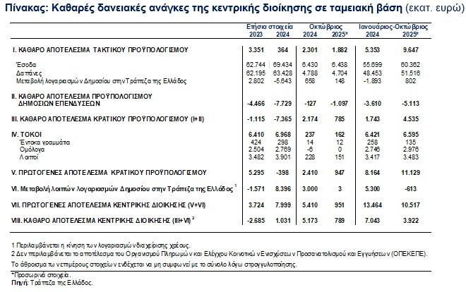 Την περίοδο Ιανουαρίου-Οκτωβρίου 2025, το ταμειακό αποτέλεσμα της κεντρικής διοίκησης παρουσίασε πλεόνασμα 3.922 εκατ. ευρώ, έναντι πλεονάσματος 7.043 εκατ. ευρώ την αντίστοιχη περίοδο του 2024, σύμφωνα με την Τράπεζα της Ελλάδος.