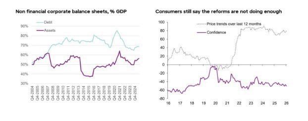 Ωστόσο, η δομή της οικονομίας εμφανίζεται πιο υγιής, με τις επενδύσεις να έχουν αυξηθεί κατά 68% από τα χαμηλά, παρότι το συνολικό τους ποσοστό παραμένει χαμηλό.