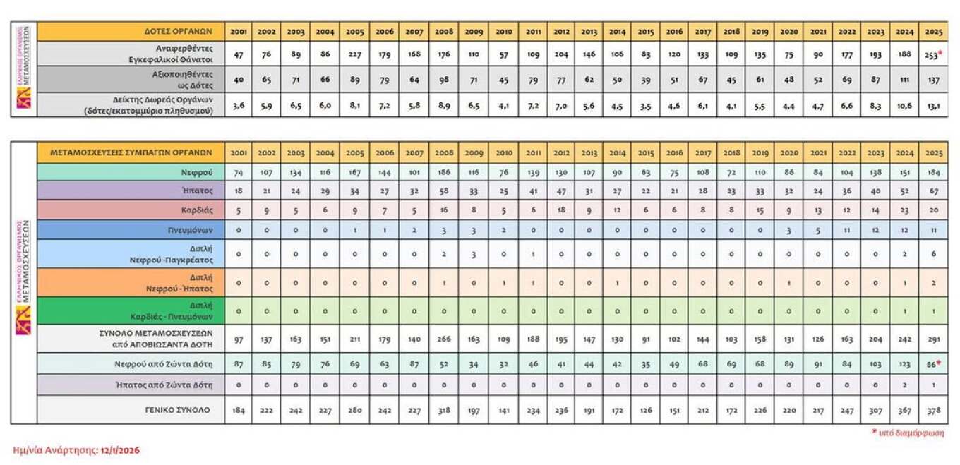 Ξεκινώντας από συγκριτικά στοιχεία, «το 2019 πραγματοποιήθηκαν 226 μεταμοσχεύσεις οργάνων στη χώρα μας ενώ το 2025 έκλεισε με 378 μεταμοσχευτικές επεμβάσεις, δηλαδή 152 περισσότερες. Μια αύξηση της τάξης του 67% που αποτελεί και την καλύτερη επίδοση ιστορικά για τα ελληνικά δεδομένα.