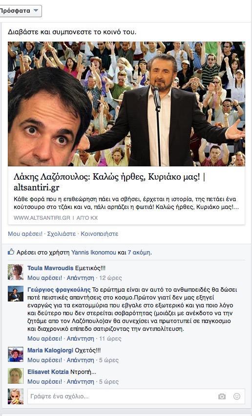 Σάλο έχει προκαλέσει στο διαδίκτυο το άρθρο του Λάκη Λαζόπουλο που δημοσιοποίησε πριν από λίγες ώρες στο altsantiri.gr. Πολλοί φίλοι των κυρίων Λαζόπουλου και Μητσοτάκη έχουν κοινοποιήσει το άρθρο αυτό στις σελίδες τους με αποτέλεσμα να σχολιάζεται ποικιλοτρόπως. Οι φίλοι του Κυριάκου Μητσοτάκοι καταφέρονται εναντίον του κου Λαζόπουλου ότι έχει βγάλει χρήματα στο εξωτερικό και ότι πρωτοτυπεί παγκοσμίως σατιρίζοντας την αντιπολίτευση. Αντίθετα οι φίλοι του κου Λαζόπουλου στα social media υποστηρίζουν ότι σάτιρα δεν έχει όρια και επικροτούν το καυστικό κείμενο του γνωστού ηθοποιού.